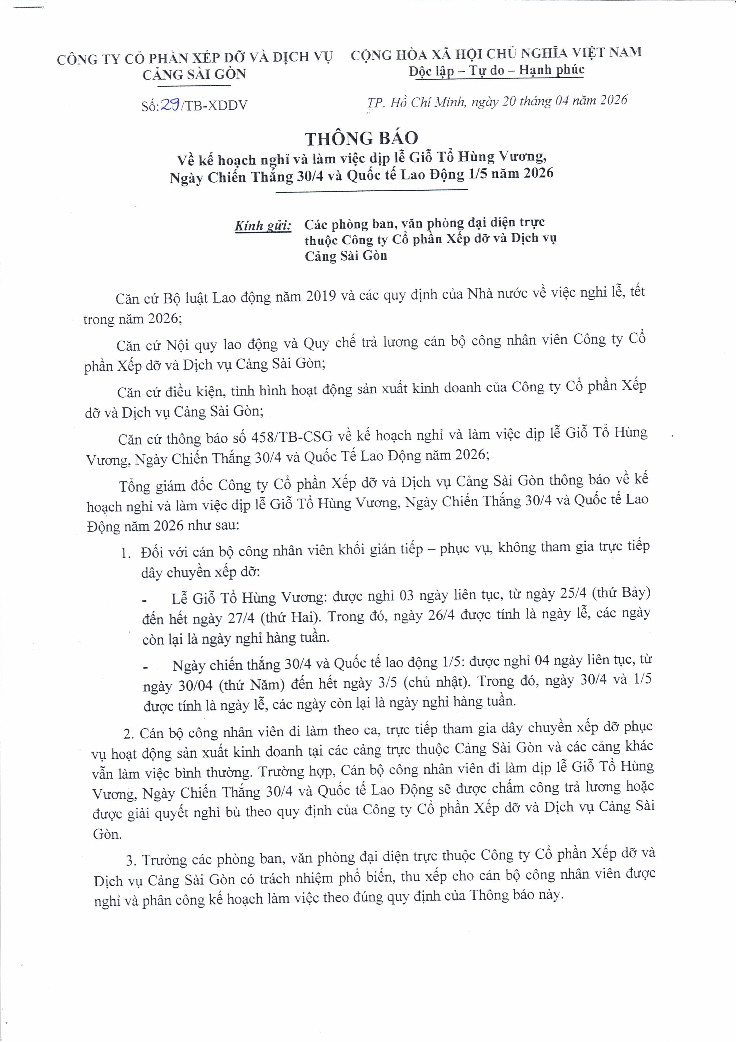 THÔNG BÁO KẾ HOẠCH NGHỈ VÀ LÀM VIỆC CÁC NGÀY NGHỈ LỄ: GIỖ TỔ HÙNG VƯƠNG, NGÀY 30-04 VÀ QUỐC TẾ LAO ĐỘNG 01-05-2026.